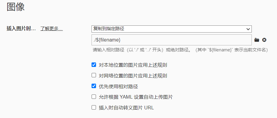 typora中的设置(设置插图保存):位置在格式-图像-全局图像偏好(如果图像是灰色可能你处于源代码模式,需要改变模式),设置如下:1)选择复制到指定路径;2)修改路径为./${filename},意思为插入的图片复制到md同名文件夹下;3)设置使用相对路径